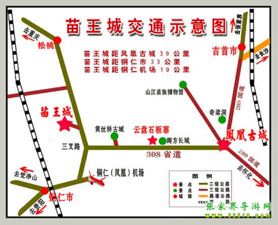 2、銅仁方向:自銅仁火車站往湖南方向經(jīng)過銅仁鳳凰飛機(jī)場(chǎng)附近(20公里處)、三岔路(23公里處)、蔬菜基地百合基地(26公里處)、中國(guó)苗王城牌樓(30公里處)、苗王茶園(30公里處)、苗王城生態(tài)農(nóng)業(yè)觀光點(diǎn)(桃林、金果林)、苗王城停車場(chǎng)售票處(33公里處)。