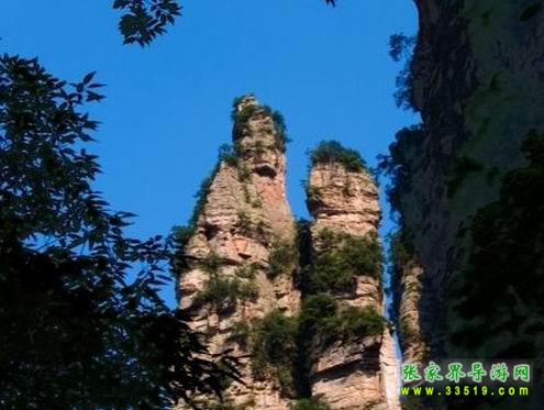 沿田家臺后坡石徑上行約400米,有一座依山而立的觀景臺。站立臺上,見對面200多米處兩峰相依,酷似一堆夫妻并肩而立,五官俱全,面向東南。那峰頂?shù)臉淠净ú萸∷扑麄z的頭發(fā)、頭巾和頭飾,反襯出二人臉面白凈明晰。妻子嬌小,緊傍其夫,低眉含羞,似竊竊私語;丈夫粗狂豪達,眉飛色舞,笑口張開,皓齒畢露,似充滿幸福和滿足。眾多游客觀此景時無不驚嘆稱奇,以致廣泛傳言:觀賞后,新婚夫婦忠貞不渝,老年夫婦煥發(fā)青春,反目夫婦重歸于好。