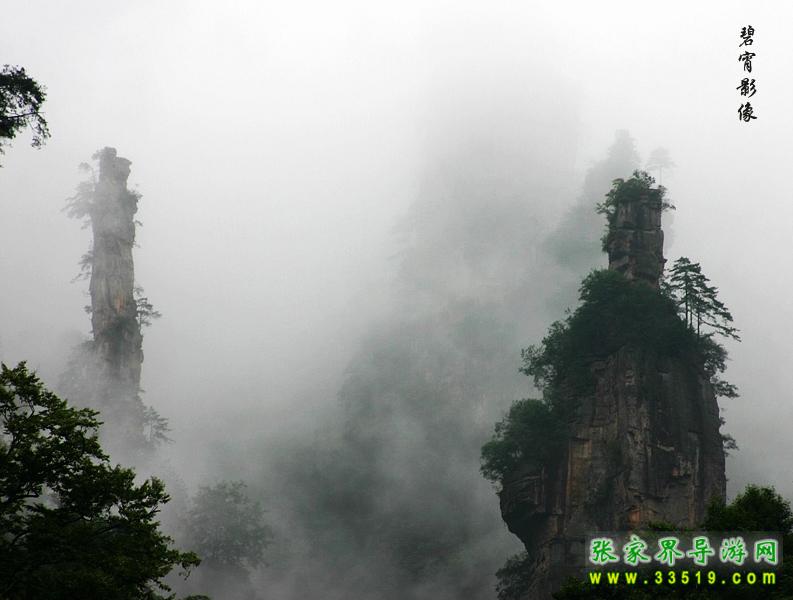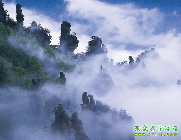 天子山還有云霧、月夜、霞日、冬雪四大奇觀。云霧,是天子山最多見的天象奇觀。有云霧、云海、云濤、云瀑和云彩等景象。久雨初晴之后或霏霏 細(xì)雨之中,先是朦朧大霧,繼而形成白云,環(huán)繞飄浮。群峰在無邊無際的云海中時(shí)隱時(shí)現(xiàn),使人仿佛置身于蓬萊仙境之中。有時(shí)云霧從溪口涌出,爬過峰頂, 然后以鋪天蓋地之勢(shì),飛瀉而下,形成云瀑,十分壯觀。月夜,當(dāng)月明星稀,萬籟俱寂時(shí),這里的峰林被朦朧月色披上了一層“魔紗”,似一群群魔影聳立在幽谷之中。耳聞禽獸嚦嚦的叫聲,使人產(chǎn)生一種神秘感。霞日,晴天的早晨,一輪紅日在朵朵紅云的襯托下,從奇山異峰中冉冉升起。千萬座石塔,婷婷玉立,披上一層紅霞,十分迷人。 冬雪,入冬,天子山銀裝素裹,青松和峰頂被大雪復(fù)蓋。此時(shí)的天子山冰柱倒立,冰花四散,只有一些山鹿 、野豬,才不為銀白世界所征服。