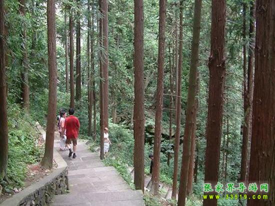 這一大片杉樹林是由張家界國營林場(張家界國家森林公園的前身)工人們種植的。過去“大煉鋼鐵”運(yùn)動,差點(diǎn)把張家界的山頭全部變成了光頭。后來,一些林場工人抱著“頭發(fā)白在張家界,牙齒掉在張家界,死了埋在張家界”的決心,“獻(xiàn)了青春獻(xiàn)終身,獻(xiàn)了終身獻(xiàn)子孫”,發(fā)誓要植樹造林,綠化張家界。幾十年過去了,許多人綠了青山白了頭,他們的心愿終于變成了眼前的現(xiàn)實(shí)。腳下這條彎彎曲曲而又平平整整的游道是20世紀(jì)80年代修建的。漫步其上,山風(fēng)陣陣、鳥雀聲聲、奇花朵朵,群峰在樹林中若隱若現(xiàn),很有“蟬鳴林逾靜,鳥鳴山更幽”的幽靜與“采菊東籬下,悠然見南山”的悠然。