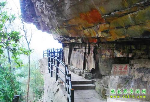 眼前這塊石壁上,中間突出一塊很大的巖罩,形成了一個(gè)高3米,進(jìn)深1—3米,寬20多米的巖屋,人稱大巖屋。這屋以前有窮人住過,當(dāng)年林場工人也曾在這兒安營扎寨。這兒現(xiàn)在一來可以休息,二來可以觀景。巖屋下20米,有一支山峰很像葫蘆,名叫仙丹葫蘆。有人說那有點(diǎn)像湘泉集團(tuán)“酒鬼酒”的酒瓶,也有人說有點(diǎn)像王母娘娘的花瓶。自然景觀很多時(shí)候往往是這樣,三分相像,七分想象,不說不像,越說越像。