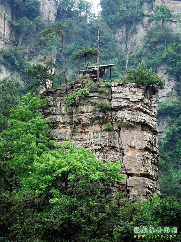 這座拔地而起高300多米的巨大山峰,四面絕壁,頂部面積約4公頃,上面長著黑黝黝一大片原始森林。20世紀(jì)70年代,曾有林場工人試圖爬上去考察,但因下雨石滑,無功而返。借助望遠(yuǎn)鏡,可以清楚地看到上面生長的武陵松——說起武陵松(又名巖松),可能沒有黃山松那么出名,但其特色卻絲毫不遜于黃山松,堪稱張家界一絕。有人說:“桂林醉人是漓江清,峨眉風(fēng)流是金頂云,華山險(xiǎn)在倚天看,廬山美在泉中聽,不及湘西武陵源,數(shù)千奇峰纏綠云,石上長森林。”“石上長森林”說的就是武陵松。她“千年長不大,萬年長不老”,長在絕頂之上或絕壁之中,不論風(fēng)吹雨打,嚴(yán)寒酷署,總是精神煥發(fā),一看見這瘦小而蒼勁的武陵松,就不由讓人頓生對生命的敬意。