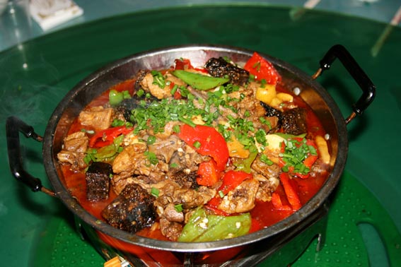 【 鳳凰血粑鴨子 】 血粑鴨子是鳳凰最具特色的地方菜之一,制作時將預先浸泡好的上等糯米裝入碗里,宰殺鴨子時將鴨血溶入糯米浸泡均勻。等鴨血凝固了,再蒸熟,放冷后,將血粑切成一小塊小塊的方塊,然后用菜油煎熟。待鴨肉煮九分熟時,再將血粑放入鴨肉里烹煮,并摻合一定的香料物品,成金黃色即可,鴨子煮血粑既有鴨肉的鮮美味濃,又有血粑的清香糯柔,吃起來口感香濃,食欲大增,真是稀有的人間美味佳肴。