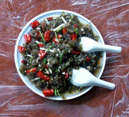 【 酸辣子炒沙蘿菇 】 當?shù)卮合募居旰?,山頭巖石壁上生長的墨綠色地菇——地衣(本地名為沙蘿菇),采集后用清水反復多沖洗幾次。再用壇子腌的酸辣椒和大蒜一起炒熟,出鍋后灑些許香蔥即成一道色、香、味俱全的地方特色小吃。
