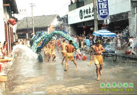 張家界潑水龍又叫“澆水龍”,于唐朝時(shí)期由移居本地的白族興起演變而成,在永定區(qū)的尹家溪鎮(zhèn)西尹村、莫家崗村十分盛行,是當(dāng)?shù)?a class="insidelink" href="http://www.856641.com/fengqing/" title="土家族">土家族,白族、苗族在天熱干旱時(shí)節(jié)求雨祈福的一種形式。一旦出現(xiàn)旱災(zāi),當(dāng)?shù)仡^面人物就會(huì)出來組織潑水龍,演出極其隆重。