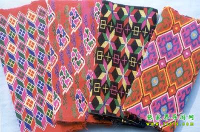 織錦。又名“西蘭卡普”、“土花鋪蓋”,為土家族傳統(tǒng)工藝品之一,是森林公園工藝品廠的主要產品??楀\是在特制的本質織機上以錦紗為經、五彩絲線為緯、手工提花織成。以其質地厚實、堅韌,色彩鮮艷,格調古樸,流暢生動著稱。圖案有花草、鳥獸、生產、生活、幾何、字樣等種類。為舊時土家姑娘必備嫁妝之一。據考證,早在漢代,土家織錦就作為方物貢入漢室宮廷。20世紀后,土家織錦曾漂洋過海至日、美、英等國展出,并作為禮品,被國家領導人贈送給外國元首及政府官員,如今織錦以壁掛、枕巾、沙發(fā)墊、桌圍、提袋、服飾等多種式樣遠銷世界各地。