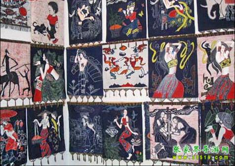 刺繡。是土家姑娘在直紋平布上,按照布紋的經緯和預先繪畫的花樣與底色不同的絲線繡成圖案。舊時姑娘們穿的繡花衣服,繡有服飾花邊、胸花、帽花,此外繡花枕頭、繡花荷包等也是精巧的手工工藝品。土家刺繡在配色上有自己的講究與習慣,一般選用青、藍、大紅等深色布料作底布,用淺色繡線制作圖案,或者相反,兩種用法的結果使繡品顯得質樸逼真,色澤鮮艷,對比強烈。傳統(tǒng)圖案有“花開富貴”、“龍鳳呈祥”、“鴛鴦戲水”、“喜鵲鬧梅”、“松鶴同壽”等,分室內、衣著、工具、行李裝飾等多種種類。在景區(qū),土家婦女邊繡邊賣的精美鞋墊,深受海內外游客喜愛。