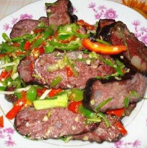 介紹: 血豆腐,就是將豆腐和豬血、豬肉及花椒、辣椒等佐料拌成泥狀,捋成卵形,以竹篩置火炕上,煙熏烤成臘黃,吃起來耐嚼味香,是土家特色菜,當(dāng)?shù)厝顺R云湎戮啤?在張家界的飯館里很難吃到正宗的土家特色菜,可以去做土味的特色餐館去解解饞。但是最正宗還是鄉(xiāng)下人家家里自己熏的,那才叫一個好吃?。?!