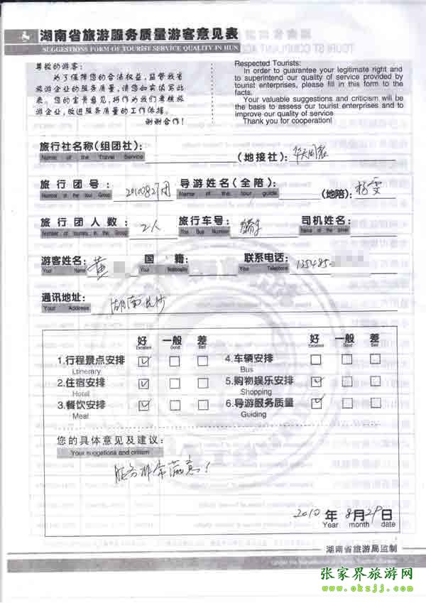 2010年8月29日長沙黃先生一行2位旅游質量反饋:服務非常滿意